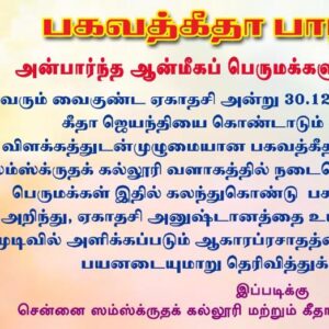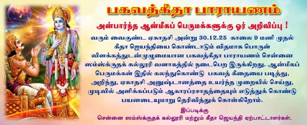 Gallery / Bhagavad gita Day Bhagavad gita Day गीताजयन्ती उत्सवः Bhagavad Gita Day sponsored by Tennangur Arunachala Ramachandra iyer Endowment Gita Recitation and Discourse 32 images Created: December 31, 2025
