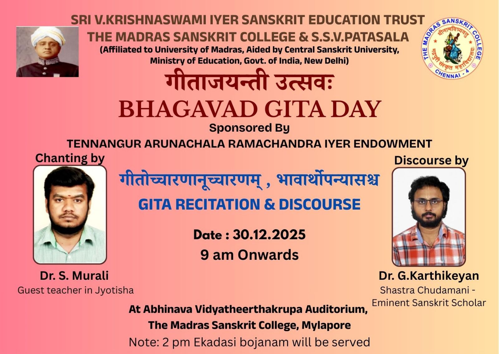 गीताजयन्ती उत्सवः Bhagavad Gita Day Sponsored by Tennangur Arunachala Ramachandra Iyer Endowment. Gita Recitation and Discourse on 30.12.2025 at 9A.M at The Madras Sanskrit College premises